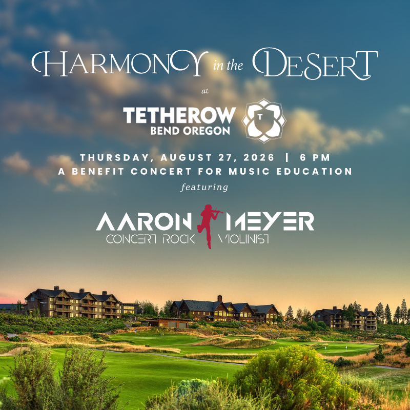 “Harmony” is coming to Bend, Oregon this August. Plan for an evening of stunning views surrounded by the uplifting music of Concert Rock Violinist Aaron Meyer. Aaron, his virtuosic band, and mentored students from Concert Rock Academy will perform outdoors on the green at Tetherow Resort.